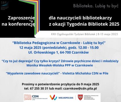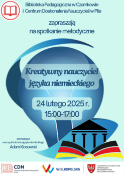 Biblioteka Pedagogiczna w Czarnkowie i Centrum Doskonalenia Nauczycieli w Pile Serdecznie zapraszają nauczycieli na spotkanie metodyczne "Kreatywny nauczyciel języka niemieckiego", które odbędzie się w poniedziałek 24 lutego 2025 , w godz. 15.00 - 17.00 w Bibliotece Pedagogicznej w Czarnkowie, ul. Orłowskiego 1.